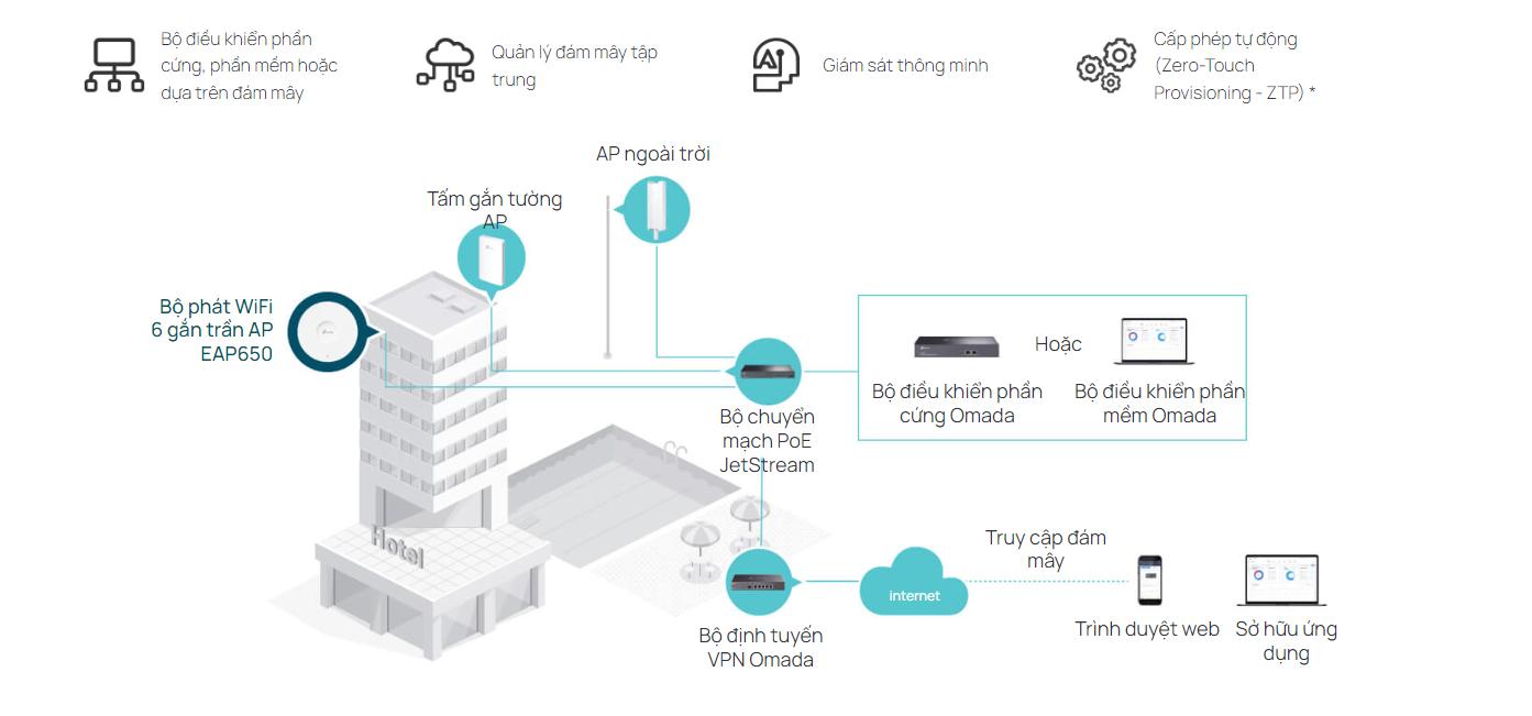 Một trong những tính năng nổi bật của EAP650 là khả năng chuyển vùng liền mạch, đảm bảo kết nối không bị gián đoạn khi người dùng di chuyển giữa các khu vực khác nhau trong mạng. Điều này đặc biệt hữu ích đối với các môi trường lớn như khách sạn, bệnh viện hoặc khuôn viên trường học.