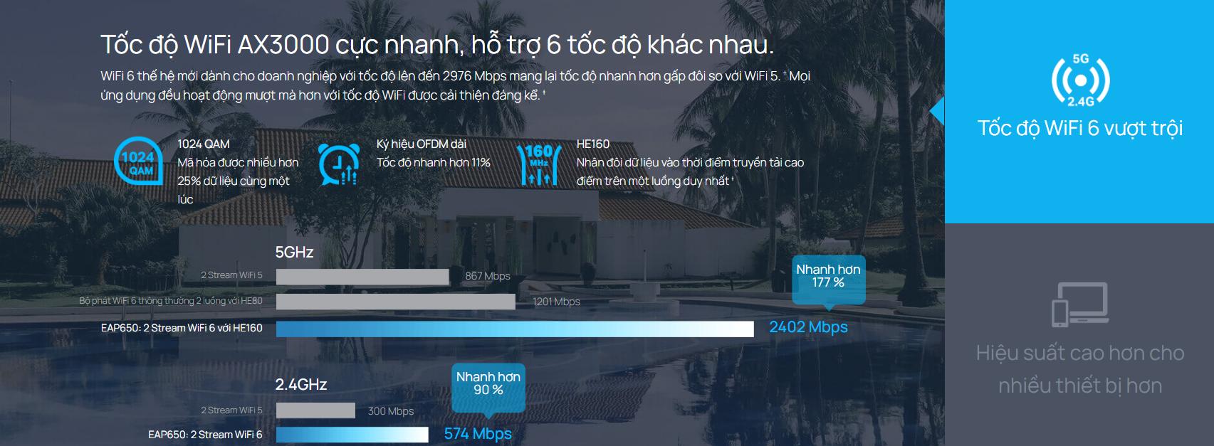 EAP650 được trang bị công nghệ Wi-Fi 6 (802.11ax), mang lại tốc độ truyền tải dữ liệu vượt trội lên đến 2976 Mbps. Điều này giúp cải thiện hiệu suất mạng, giảm độ trễ và tăng khả năng đáp ứng khi kết nối với nhiều thiết bị cùng lúc. Công nghệ OFDMA và MU-MIMO tích hợp giúp tối ưu hóa băng thông, đảm bảo mọi thiết bị đều có trải nghiệm mượt mà, ngay cả trong môi trường đông đúc.