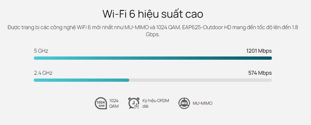 EAP625-Outdoor HD được trang bị công nghệ Wi-Fi 6 tiên tiến, cung cấp tốc độ nhanh hơn, độ trễ thấp hơn và khả năng kết nối đồng thời nhiều thiết bị hơn. Với băng tần kép, thiết bị có thể đạt tốc độ lên đến 1775 Mbps (1201 Mbps trên băng tần 5 GHz và 574 Mbps trên băng tần 2.4 GHz), đáp ứng nhu cầu sử dụng dữ liệu cao trong các môi trường ngoài trời như công viên, sân vận động hay khu công nghiệp.