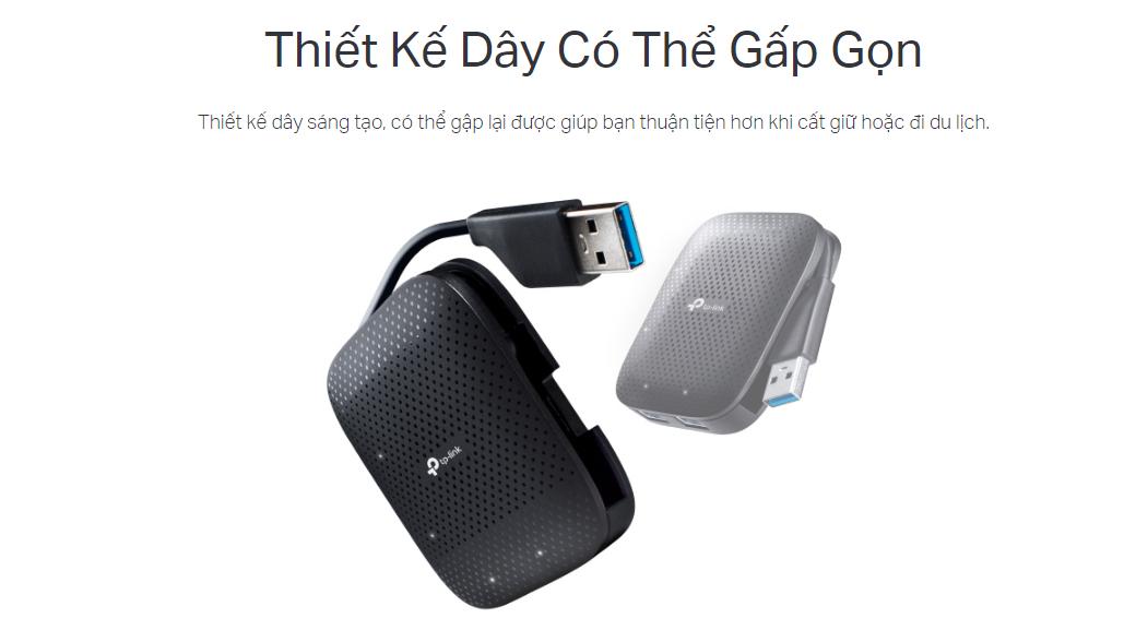 Bộ chia TP-Link UH400 có thiết kế nhỏ gọn, dễ dàng mang theo bên mình khi di chuyển. Cáp USB được tích hợp sẵn và có thể gấp gọn vào thân thiết bị, giúp tiết kiệm không gian và tránh tình trạng rối dây khi sử dụng.