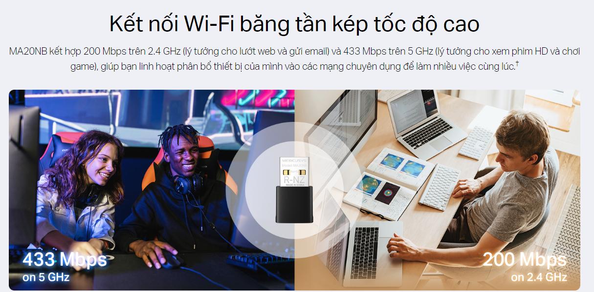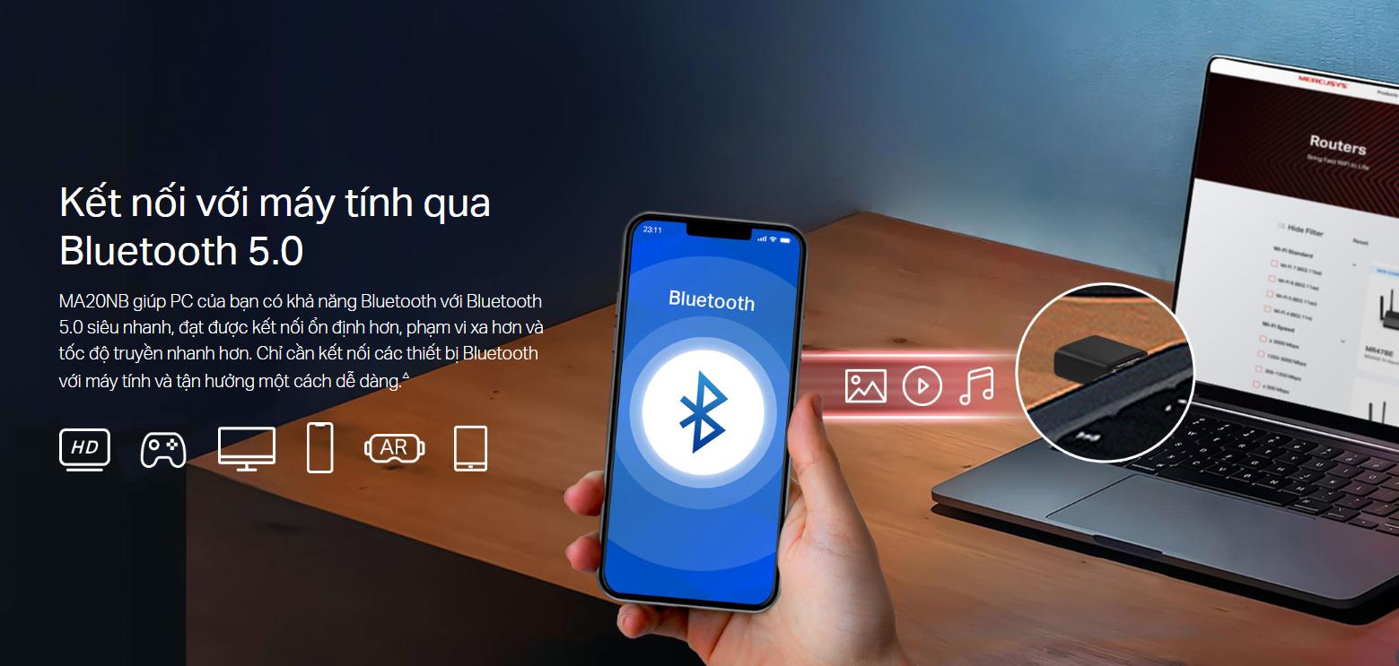 Một trong những điểm nổi bật nhất của Mercusys MA20NB là khả năng tích hợp cả Wi-Fi và Bluetooth trong cùng một thiết bị. Điều này có nghĩa là bạn không cần phải mua hai thiết bị riêng biệt để đáp ứng nhu cầu kết nối không dây. Với tính năng này, bạn có thể kết nối máy tính với mạng Wi-Fi tốc độ cao và đồng thời kết nối các thiết bị Bluetooth như tai nghe, loa, bàn phím hoặc chuột.