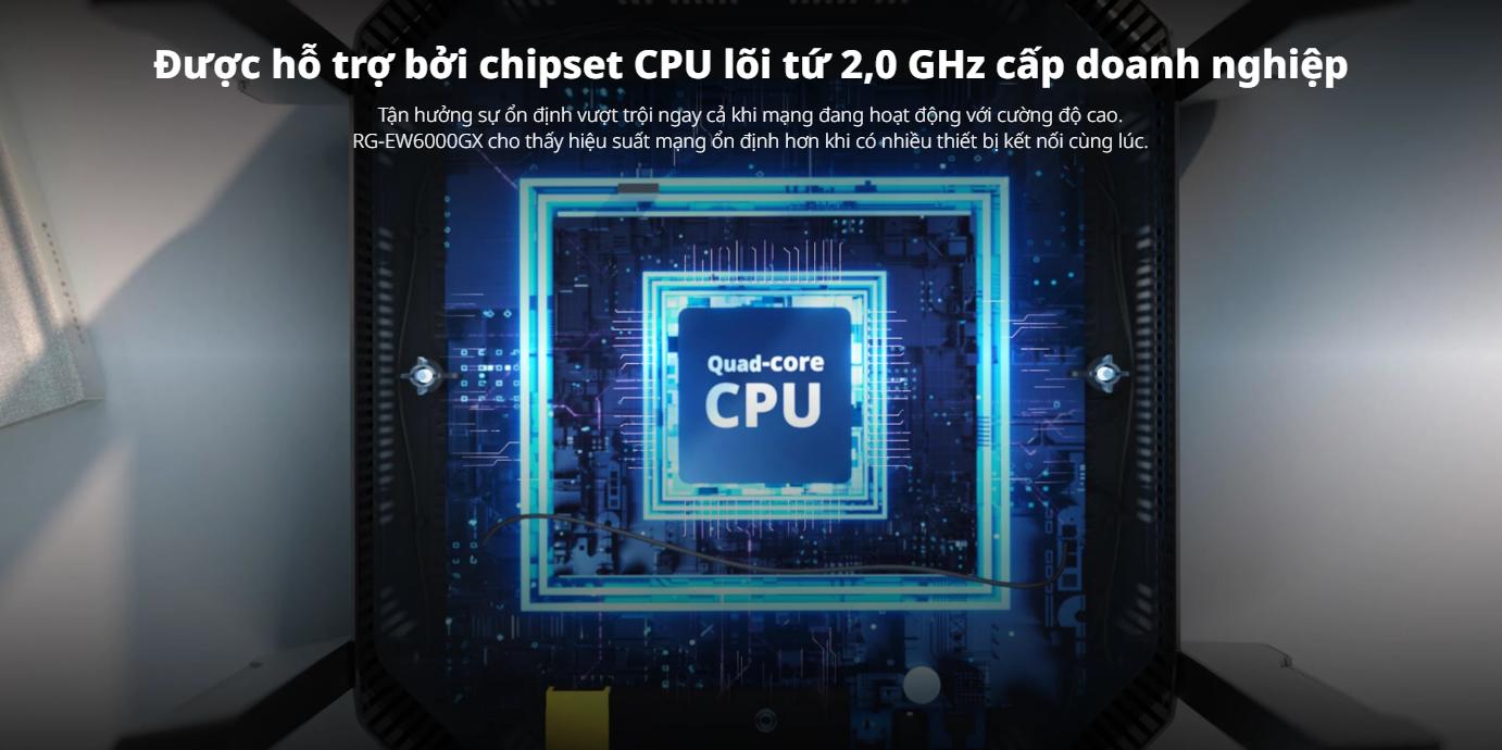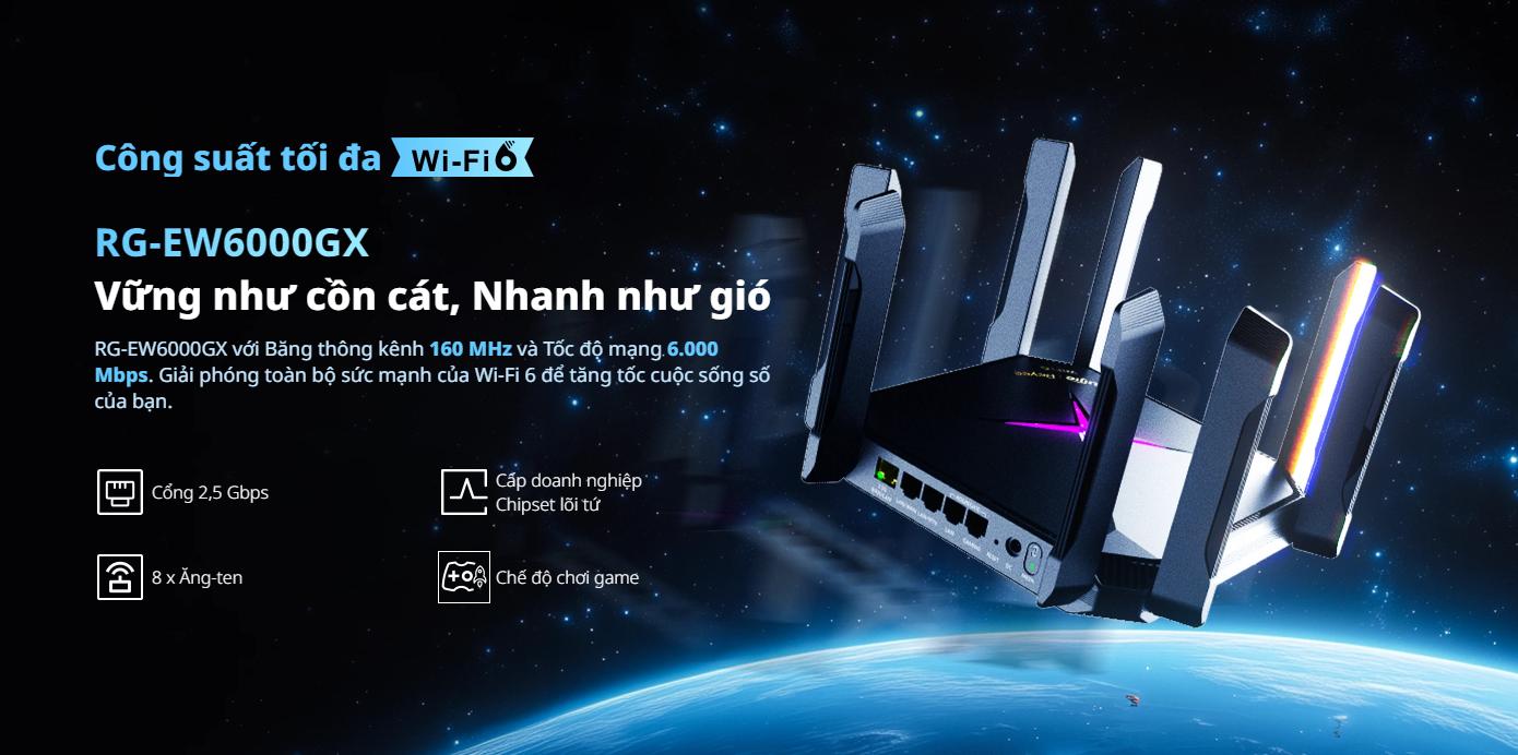 RG-EW6000GX được trang bị công nghệ Wi-Fi 6 (802.11ax) tiên tiến, giúp tăng tốc độ truyền tải dữ liệu, giảm độ trễ và cải thiện hiệu suất mạng, đặc biệt trong môi trường có nhiều thiết bị kết nối cùng lúc. Điều này đảm bảo người dùng có thể tận hưởng tốc độ mạng nhanh chóng và ổn định.