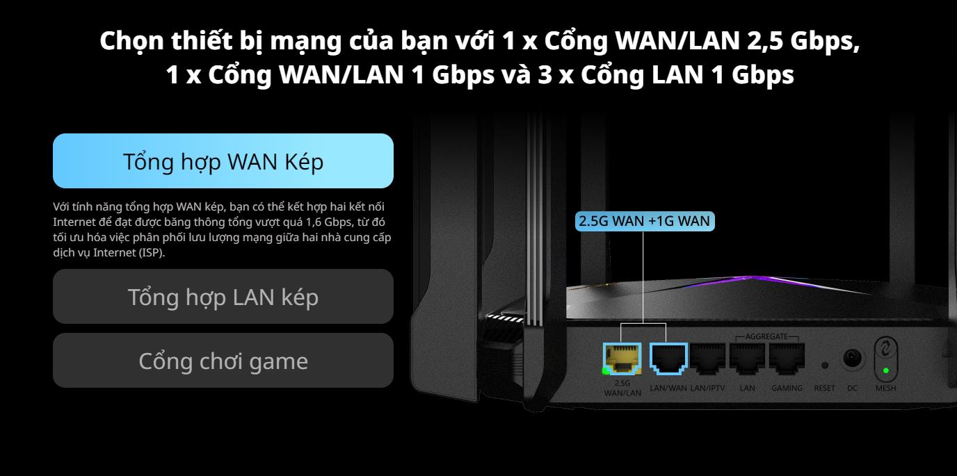 Cổng mạng: 1 cổng 2.5 Gbps WAN/LAN + 1 cổng 1 Gbps WAN + 3 cổng 1 Gbps LAN