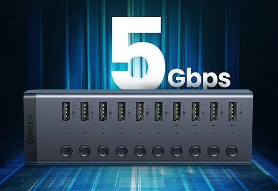 Hỗ trợ chuẩn USB 3.0, Bộ HUB Ugreen 30778 cho phép truyền dữ liệu với tốc độ lên đến 5Gbps, nhanh hơn gấp 10 lần so với chuẩn USB 2.0. Điều này giúp bạn tiết kiệm thời gian khi sao chép hoặc di chuyển các file lớn như video HD, hình ảnh chất lượng cao hay các tài liệu công việc.