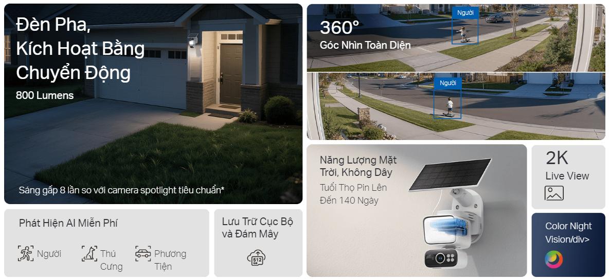 Bộ Kit camera TP-Link Tapo C615F là giải pháp an ninh ngoài trời không dây, sử dụng pin sạc kết hợp tấm pin năng lượng mặt trời giúp lắp đặt linh hoạt không cần ổ điện. Tapo C615F ghi hình sắc nét độ phân giải 2K 3MP, tích hợp đèn pha 800 lumen và tầm quay quét 360° tự động theo dõi chuyển động. Với AI phát hiện người, thú cưng, phương tiện, bạn nhận thông báo chính xác và giảm cảnh báo không cần thiết. Camera có thể hoạt động lâu dài, chống nước chuẩn IP65, hỗ trợ lưu trữ thẻ microSD hoặc qua đám mây, phù hợp bảo vệ gia đình & tài sản an toàn.