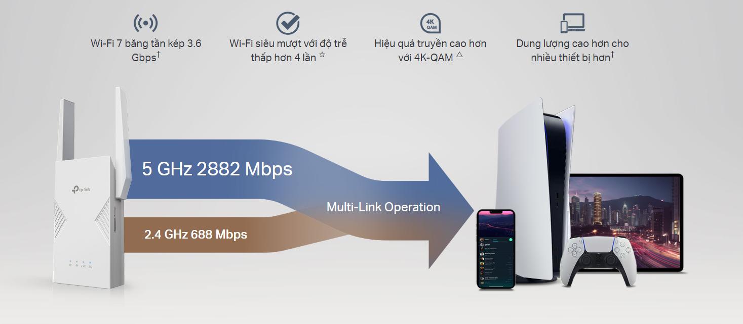 TP-Link RE235BE được trang bị công nghệ Wi-Fi 7 mới nhất, mang lại tốc độ truyền tải vượt trội lên đến 3600 Mbps. Công nghệ này không chỉ giúp cải thiện hiệu suất mạng mà còn giảm thiểu độ trễ, lý tưởng cho các hoạt động trực tuyến như chơi game, xem video 4K/8K hoặc hội nghị trực tuyến.