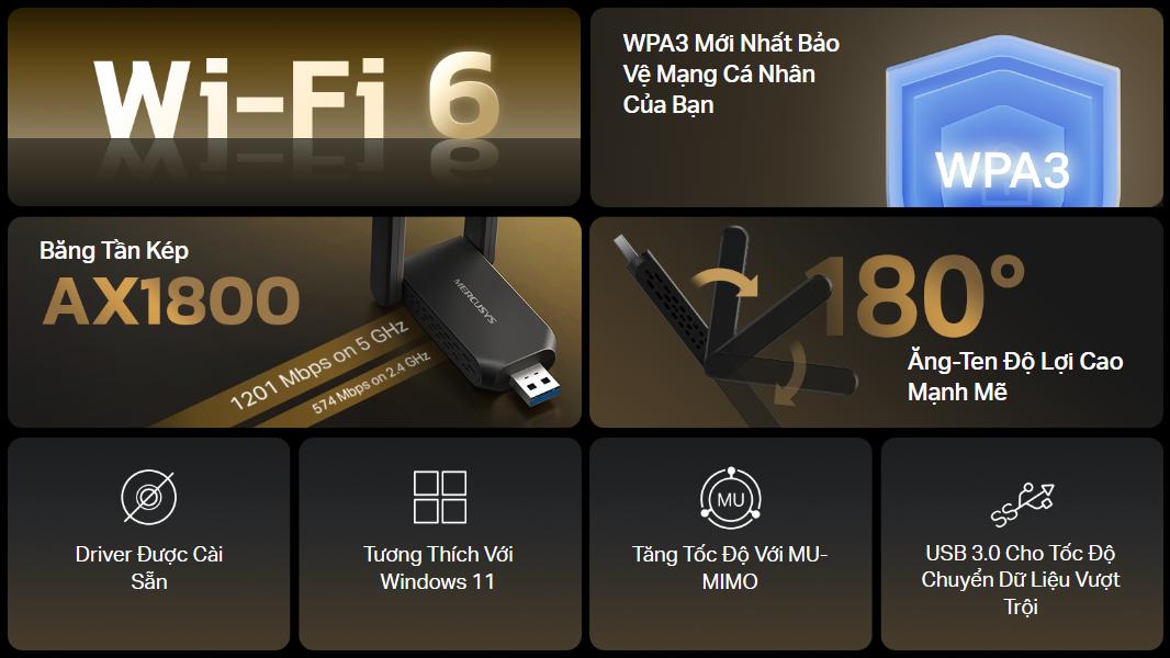 Một số tính năng cơ bản của Bộ Thu Wi-Fi 6 USB 3.0 Mercury MA72XH