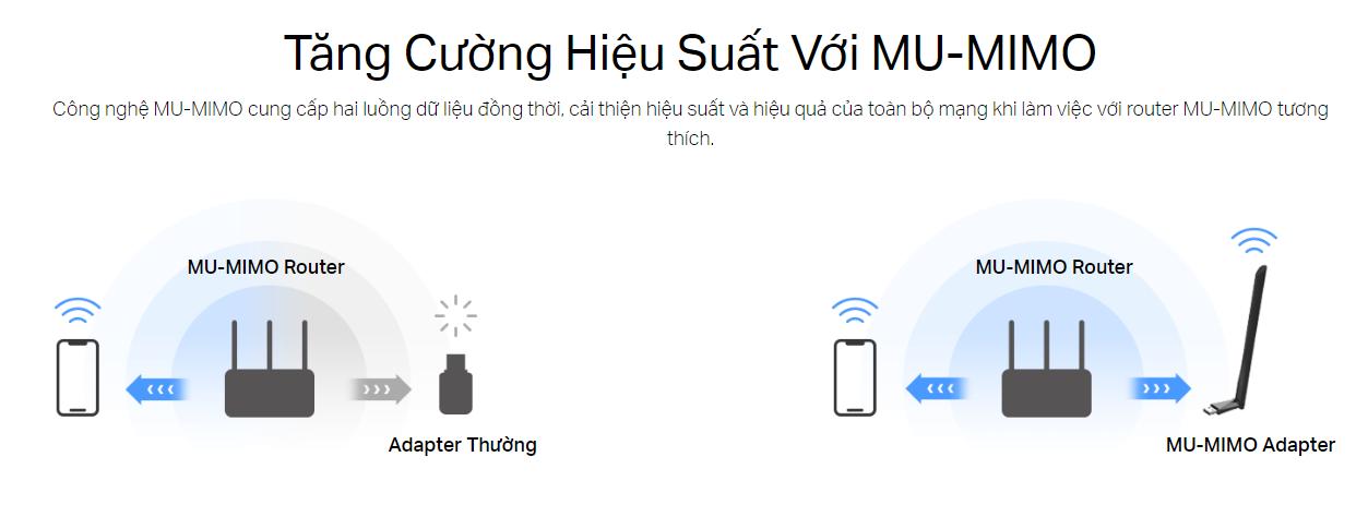 Mercusys MA30H được trang bị công nghệ MU-MIMO (Multi-User, Multiple-Input, Multiple-Output), giúp tăng hiệu quả truyền tải dữ liệu bằng cách cho phép nhiều thiết bị kết nối và sử dụng mạng cùng lúc mà không làm giảm hiệu suất.