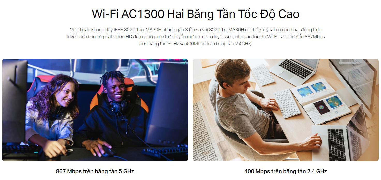 Với khả năng hoạt động trên cả hai băng tần 2.4GHz và 5GHz, MA30H mang lại sự linh hoạt trong việc lựa chọn kết nối phù hợp với nhu cầu. Băng tần 2.4GHz phù hợp cho các tác vụ thông thường như duyệt web và gửi email, trong khi băng tần 5GHz là lựa chọn lý tưởng để chơi game hoặc xem video trực tuyến với độ trễ thấp.