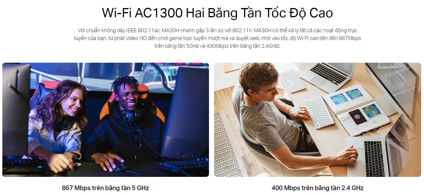 Mercury MA30H hỗ trợ chuẩn Wi-Fi AC tiên tiến với tốc độ lên đến 1300 Mbps. Cụ thể, thiết bị cung cấp tốc độ 400 Mbps trên băng tần 2.4 GHz và 867 Mbps trên băng tần 5 GHz. Điều này đảm bảo trải nghiệm lướt web, xem video HD, chơi game trực tuyến hoặc tải file lớn mượt mà và không bị gián đoạn.