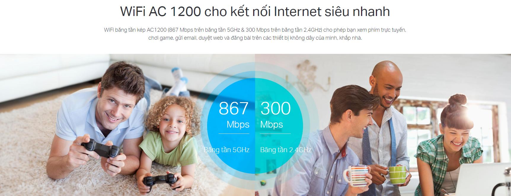 - Tốc độ: 300 Mbps trên băng tần 2.4 GHz + 867 Mbps trên băng tần 5 GHz, 1000 Mbps qua đường điện