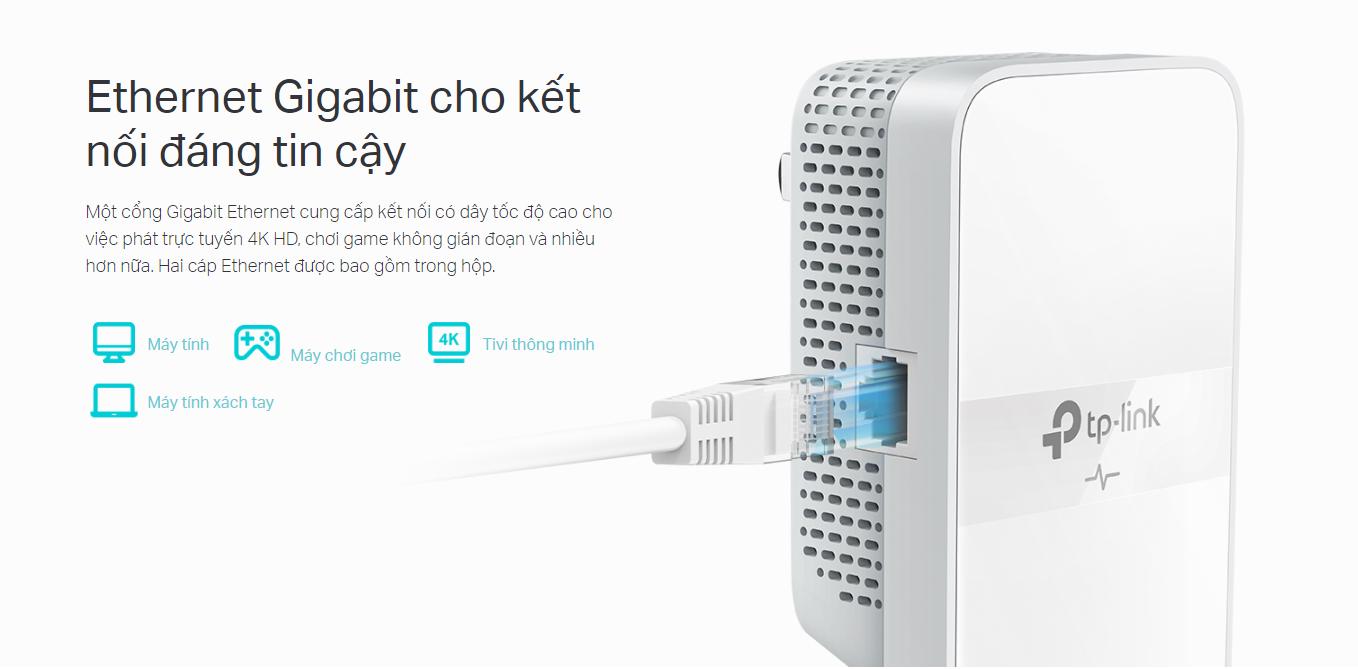 - Thông số: chip Broadcom, 1 cổng Gigabit, hỗ trợ cắm nối điện (AC-Passthrough), cắm trực tiếp vào ổ điện, chuẩn HomePlug AV2