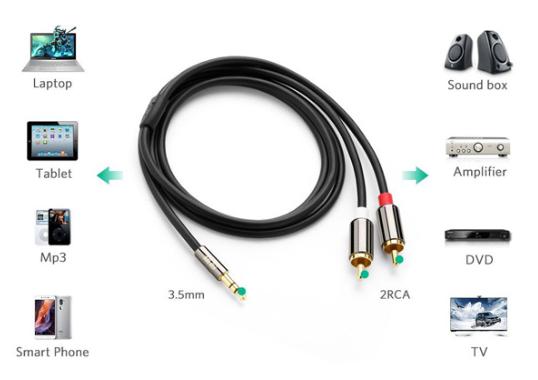 Cáp âm thanh Ugreen 10590 hỗ trợ kết nối giữa cổng 3.5mm của các thiết bị như điện thoại, laptop, máy tính bảng với cổng RCA (bông sen) của loa, ampli hoặc dàn karaoke. Sự tương thích đa dạng này giúp bạn dễ dàng kết nối và tận hưởng âm nhạc một cách tiện lợi.