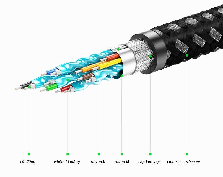 Cáp được thiết kế với lớp vỏ ngoài bằng hợp kim kẽm (Zinc Alloy) kết hợp cùng sợi carbon, mang lại độ bền vượt trội và khả năng chống nhiễu hiệu quả. Vật liệu này không chỉ giúp tăng tuổi thọ sản phẩm mà còn đảm bảo khả năng truyền tải tín hiệu ổn định trong suốt quá trình sử dụng.
