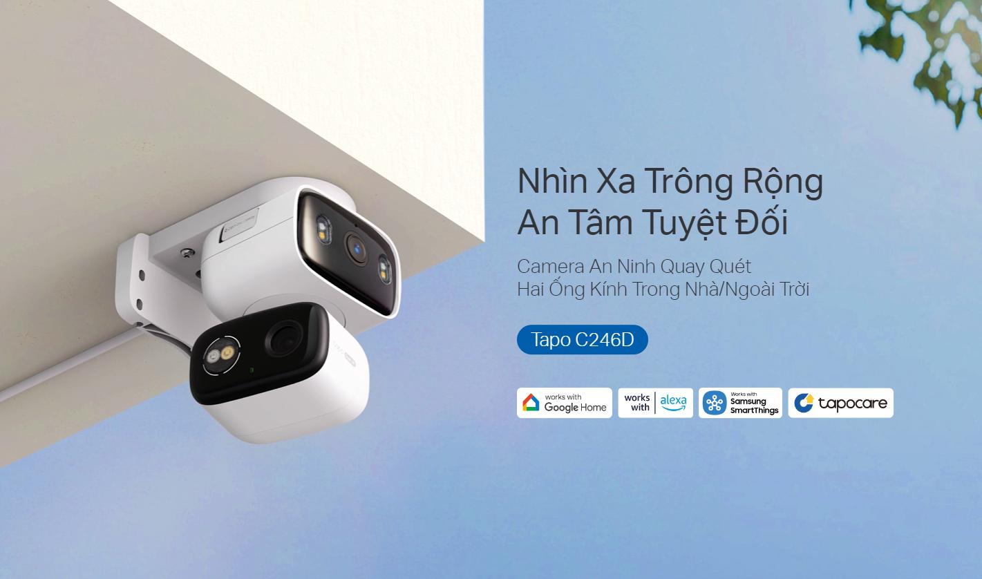 TP‑Link Tapo C246D là camera an ninh 2 ống kính độ phân giải 2K cho khả năng giám sát toàn diện trong và ngoài nhà. Với hai ống kính gồm góc rộng 125° và ống tele 6 mm, sản phẩm vừa bao quát toàn cảnh vừa zoom chi tiết rõ nét, giảm điểm mù hiệu quả. Tapo C246D tự động theo dõi chuyển động khi phát hiện người, thú cưng hay phương tiện, kèm AI nhận diện chính xác và cảnh báo tức thì không mất phí thuê bao. Hỗ trợ quan sát đêm thông minh, đàm thoại 2 chiều, lưu trữ microSD/đám mây cùng thiết kế chống nước IP65, đảm bảo an ninh chủ động cho gia đình bạn mọi lúc, mọi nơi