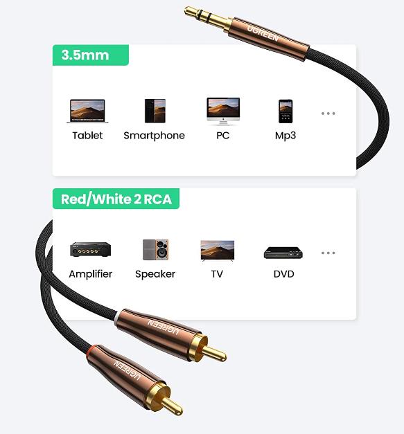 - Phù hợp với tất cả các thiết bị có cổng âm thanh 3,5 mm hoặc 2RCA (Đỏ và Trắng)