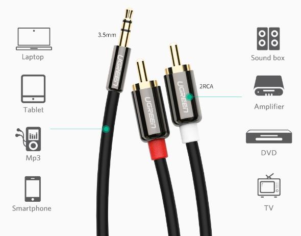 Ugreen 10591 được trang bị một đầu jack 3,5mm và hai đầu RCA, giúp dễ dàng kết nối với nhiều thiết bị khác nhau như điện thoại, máy tính bảng, laptop, loa, amply hoặc các thiết bị âm thanh khác. Đây là giải pháp lý tưởng để kết nối giữa các thiết bị hiện đại và hệ thống âm thanh truyền thống.