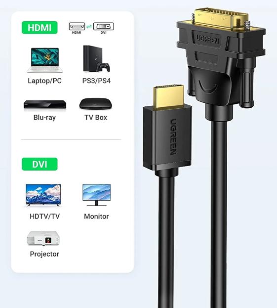 Cáp chuyển đổi HDMI to DVI của Ugreen tương thích với nhiều loại thiết bị như PC, laptop, TV Box, màn hình, máy chiếu, và các thiết bị khác có cổng HDMI hoặc DVI. Điều này giúp người dùng dễ dàng kết nối và sử dụng mà không gặp trở ngại về phần cứng.