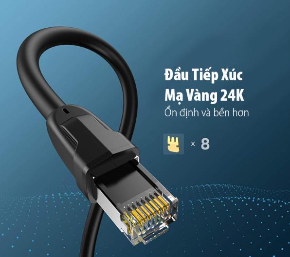 Đầu cáp RJ45 của sản phẩm được mạ vàng, giúp tăng khả năng tiếp xúc và giảm hiện tượng oxy hóa theo thời gian. Điều này không chỉ cải thiện hiệu suất kết nối mà còn kéo dài tuổi thọ của sản phẩm.