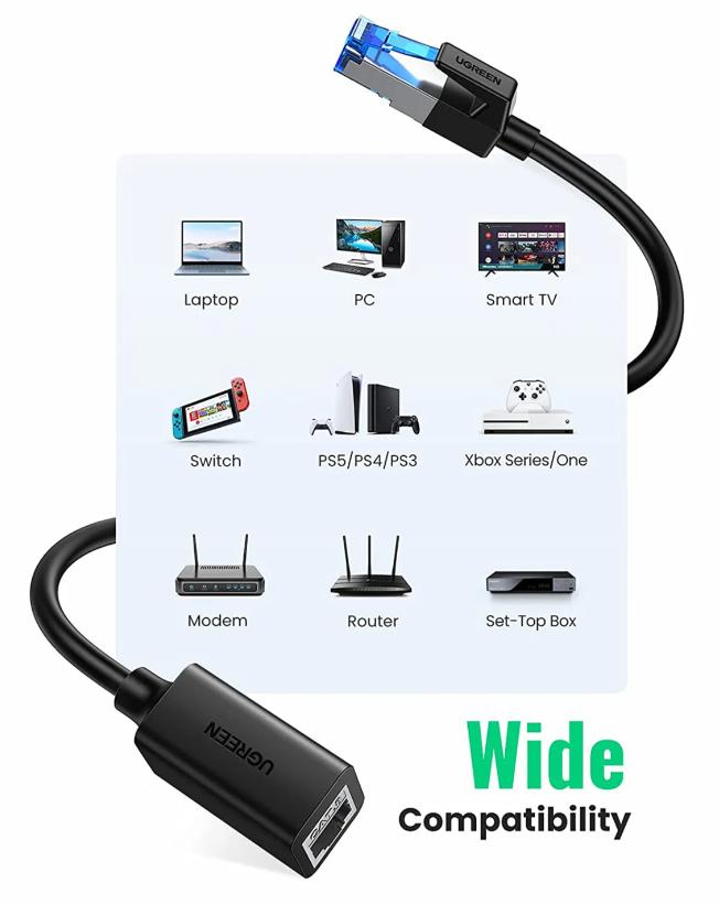 Cáp mạng Cat8 Ugreen 40497 tương thích với nhiều thiết bị khác nhau như PC, laptop, router, switch, modem, và các thiết bị mạng khác có cổng RJ45. Điều này giúp sản phẩm trở thành một giải pháp linh hoạt cho nhiều nhu cầu kết nối mạng.