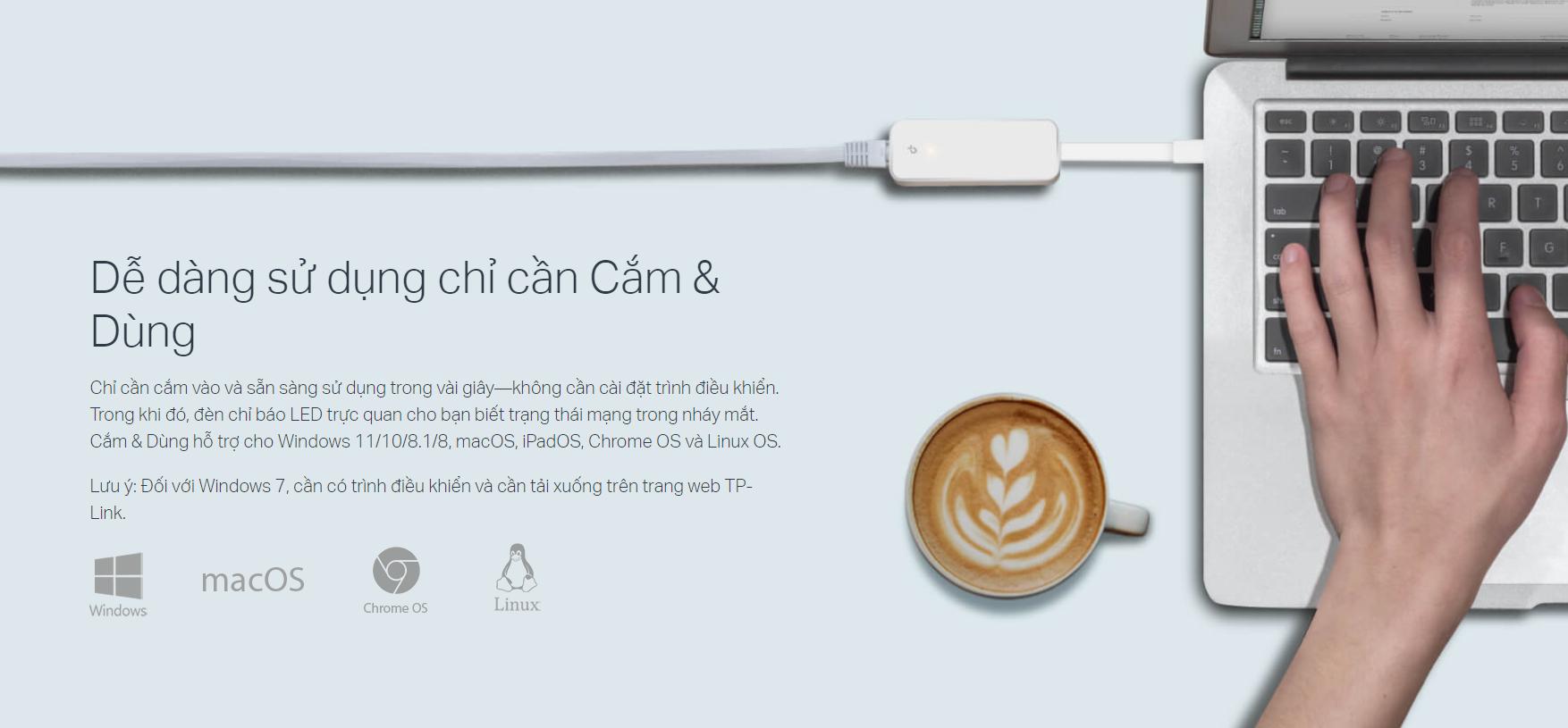 TP-Link UE300C này tương thích với nhiều hệ điều hành phổ biến như Windows, macOS, Chrome OS và Linux. Điều này giúp người dùng dễ dàng sử dụng thiết bị trên nhiều nền tảng khác nhau mà không cần phải lo lắng về vấn đề tương thích.