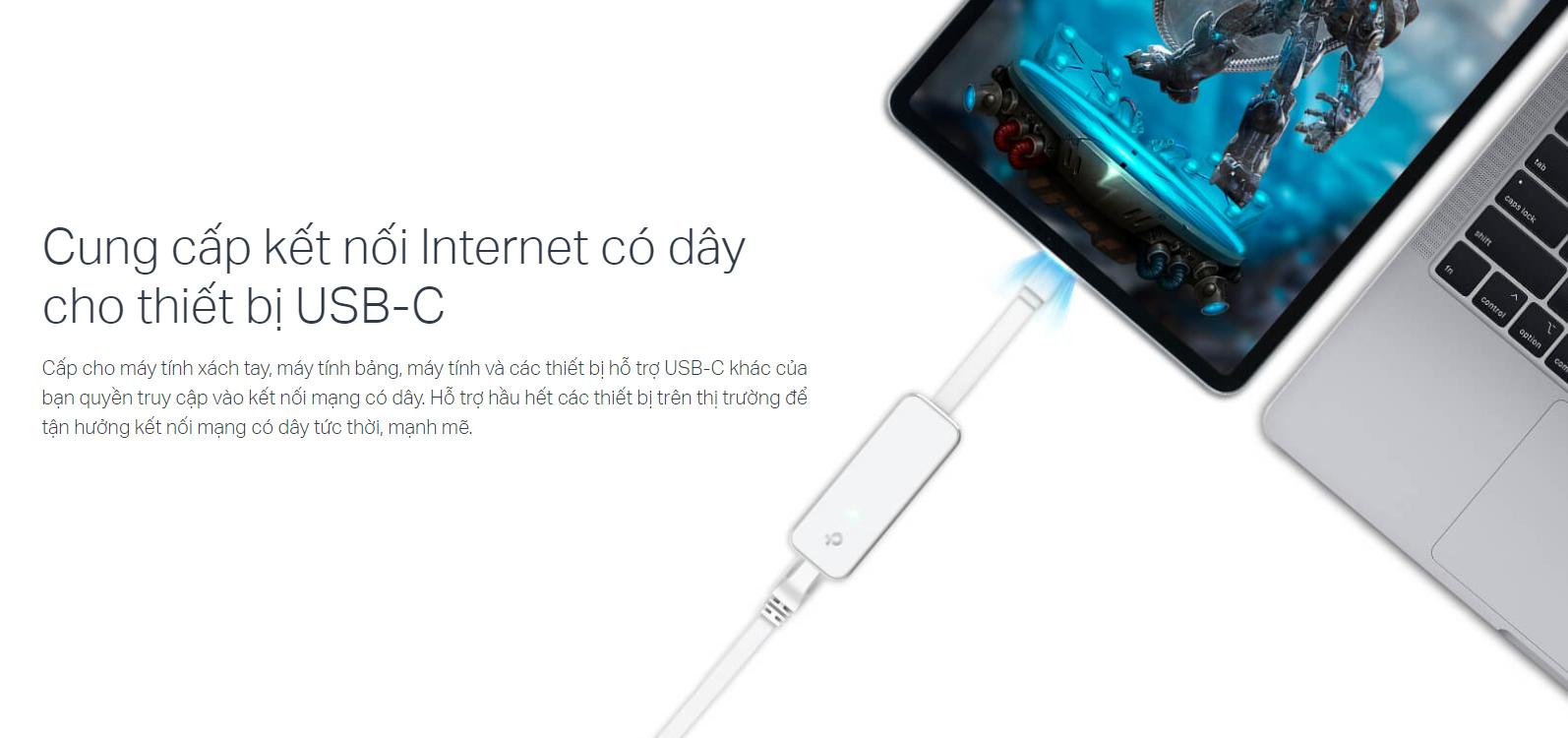 TP-Link UE300C hỗ trợ kết nối với các thiết bị như MacBook, iPad Pro, Ultrabook và nhiều dòng laptop khác sử dụng cổng Type-C. Đây là giải pháp hoàn hảo để mở rộng khả năng kết nối mạng cho các thiết bị hiện đại vốn không được trang bị cổng Ethernet truyền thống.