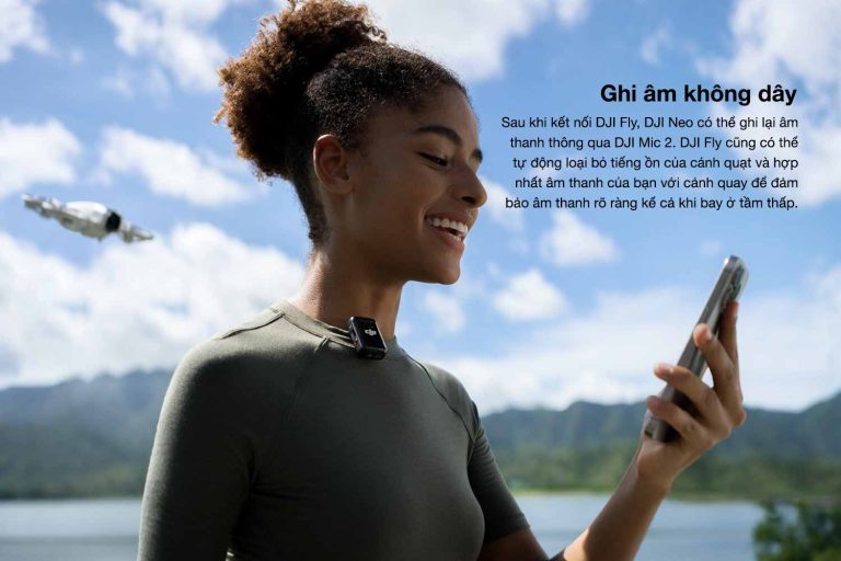 Một trong những cải tiến thực dụng nhất trên DJI Neo là khả năng thu âm thông qua ứng dụng DJI Fly trên điện thoại hoặc kết nối trực tiếp với DJI Mic 2. Hệ thống sẽ tự động loại bỏ tiếng ồn từ cánh quạt và đồng bộ hóa âm thanh trong trẻo với video, giải quyết triệt để bài toán "video có hình không tiếng" của các dòng flycam truyền thống. Bên cạnh đó, DJI Neo còn cho phép điều khiển linh hoạt qua giọng nói, ứng dụng di động, hoặc kết nối với kính Goggles để trải nghiệm cảm giác bay FPV đầy phấn khích.