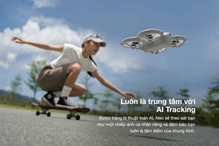 Điểm đắt giá nhất khiến DJI Neo trở nên khác biệt hoàn toàn chính là khả năng vận hành không cần tay điều khiển (Remote Controller). Chỉ với một nút bấm chọn chế độ ghi hình ngay trên thân máy, DJI Neo có thể tự động cất cánh và hạ cánh ngay trong lòng bàn tay bạn. Nhờ tích hợp các thuật toán trí tuệ nhân tạo (AI), máy bay có thể tự động bám sát chủ thể (AI Subject Tracking) trong mọi chuyển động, từ đi bộ, chạy bộ đến đạp xe. Điều này cho phép người dùng trở thành nhân vật chính trong chính thước phim của mình mà không cần một người thợ quay phim đi kèm.