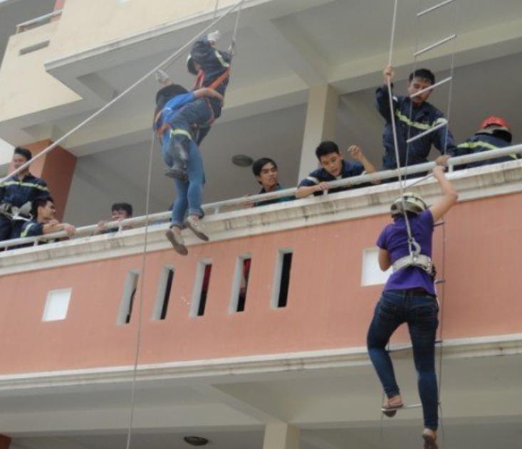 (Buổi huấn luyện sử dụng thanh dây thoát hiểm)