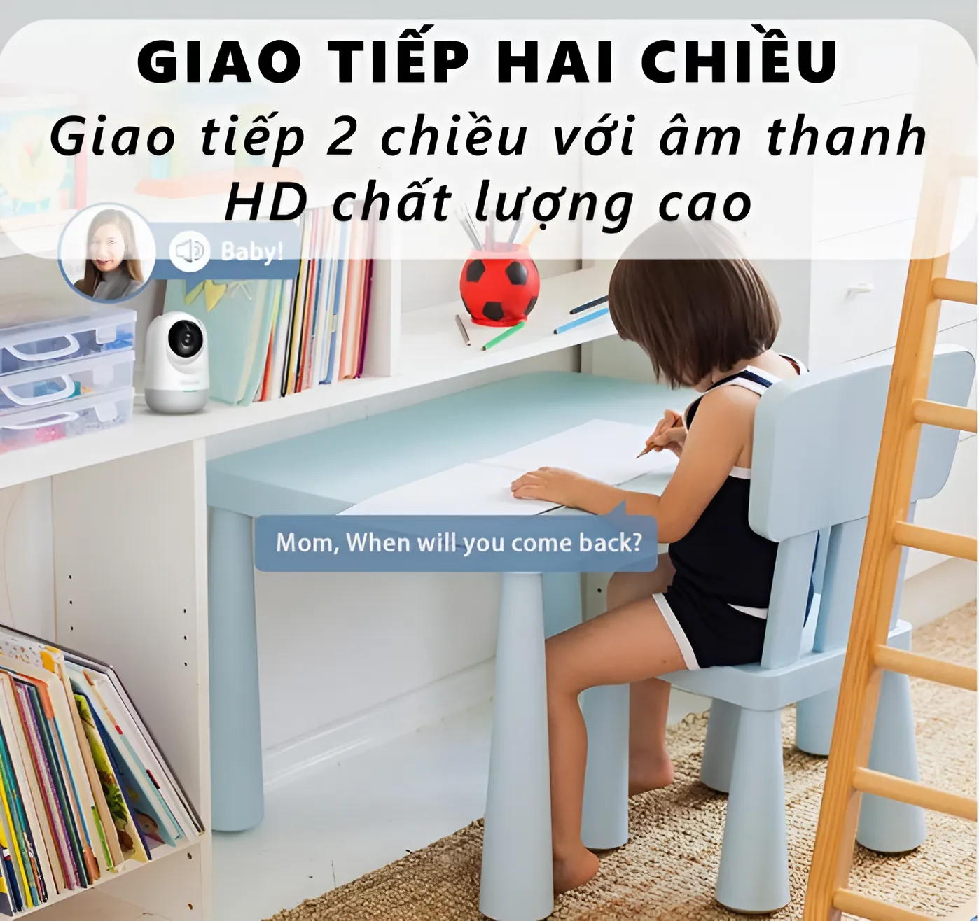 - Giám sát trẻ em: Bạn có thể sử dụng camera để theo dõi con nhỏ khi chúng đang chơi hoặc ngủ trong phòng riêng. Khi bạn vắng nhà vẫn có thể yên tâm vì quan sát được con của mình mà không bị mất quá nhiều thời gian.