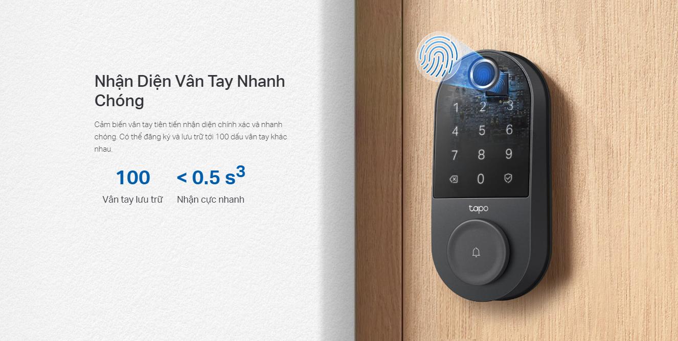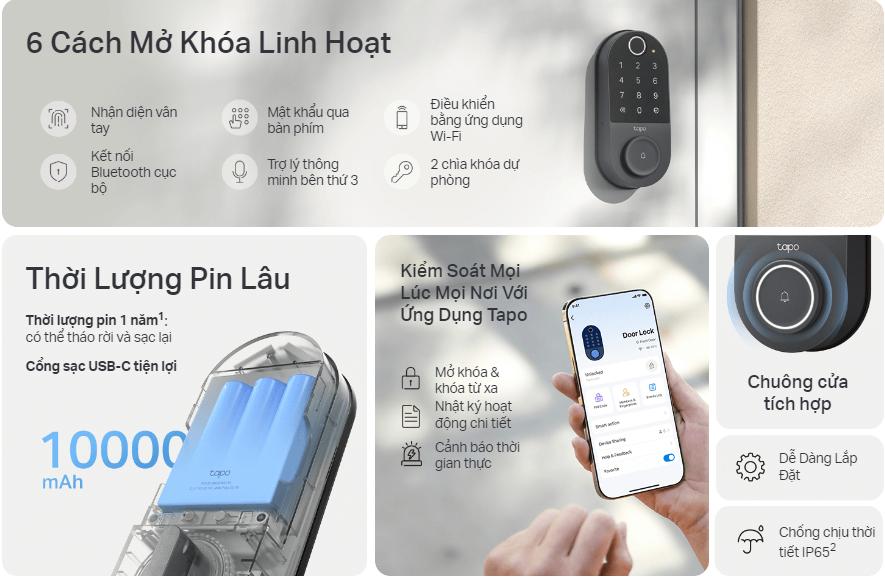 Khoá cửa vân tay Wi‑Fi Tapo DL110 là khóa cửa thông minh thế hệ mới giúp bảo vệ nhà bạn dễ dàng và tiện lợi. Sản phẩm hỗ trợ tới 6 cách mở khóa linh hoạt (vân tay, ứng dụng, Bluetooth, bàn phím, trợ lý giọng nói và chìa cơ) đáp ứng mọi nhu cầu sử dụng. Nhờ nhận diện vân tay nhanh, pin hoạt động đến 1 năm cùng sạc USB-C tiện lợi, bạn luôn an tâm sử dụng lâu dài. Tapo DL110 còn tích hợp chuông cửa, cảnh báo theo thời gian thực, quản lý truy cập từ xa và chống nước IP65, mang đến trải nghiệm an toàn và hiện đại cho gia đình.