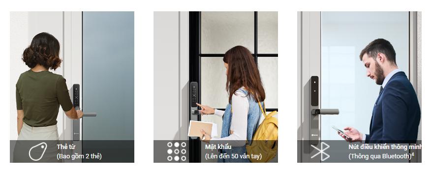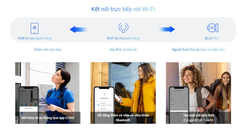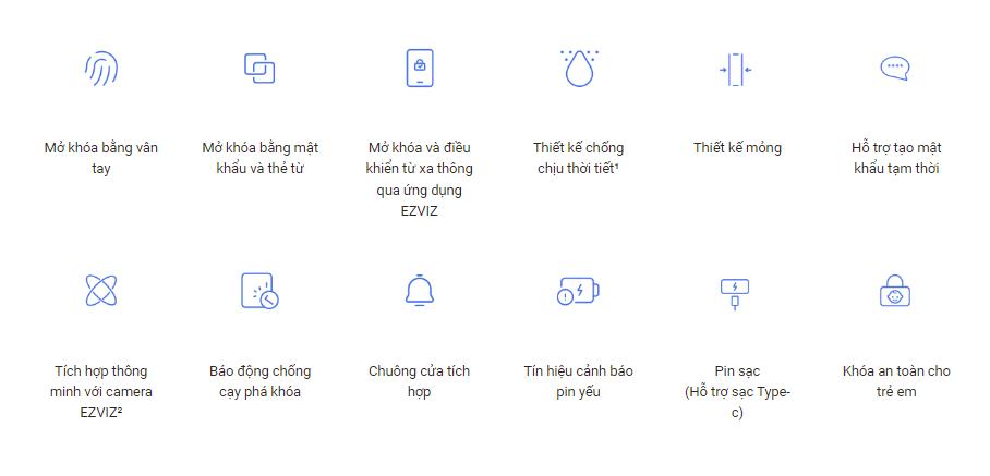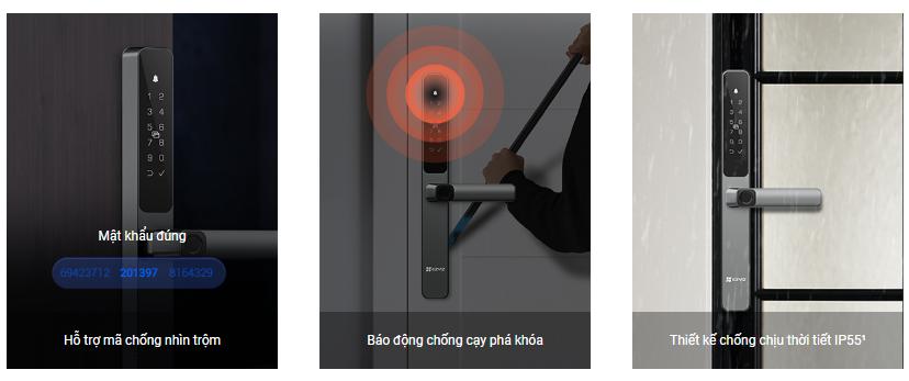 Phương thức mở khóa: Vân tay, mật mã, thẻ từ, chìa khóa cơ, Bluetooth, mở khóa từ xa qua ứng dụng EZVIZ.