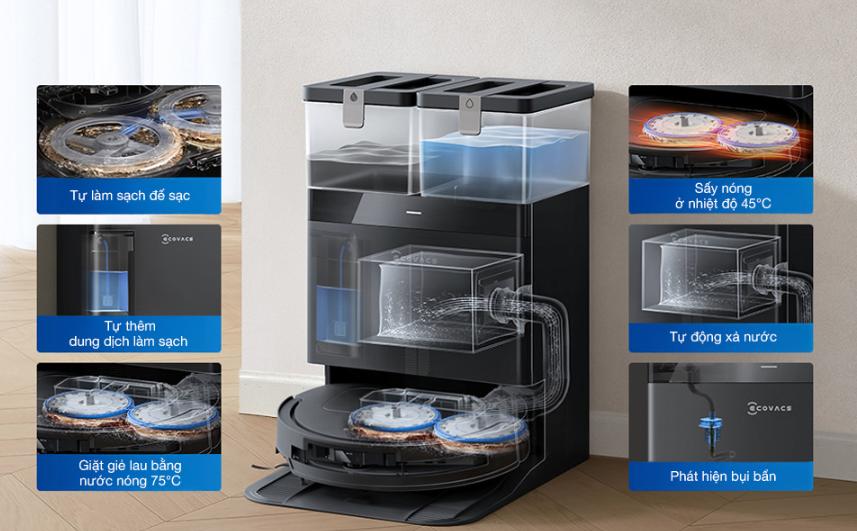 Đỉnh cao của sự tiện nghi mà Ecovacs Deebot T50 Pro Gen 2 mang lại nằm ở khả năng tự chăm sóc bản thân. Người tiêu dùng giờ đây không còn phải tiếp xúc với bụi bẩn hay giẻ lau ẩm ướt đầy vi khuẩn. Hệ thống trạm sạc đa năng sẽ thay bạn thực hiện tất cả: từ tự động đổ rác, giặt giẻ bằng nước nóng đến sấy khô bằng khí nóng để ngăn chặn mùi hôi.