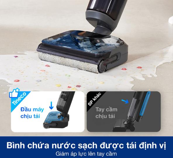Thiết kế bình nước sạch đặt ở vị trí mới giúp tạo lực ép trực tiếp lên sàn với áp lực 20N, tăng khả năng làm sạch các vết bẩn cứng đầu. Đồng thời, thiết kế này cũng giảm tải trọng lên tay cầm, mang lại trải nghiệm sử dụng nhẹ nhàng hơn.