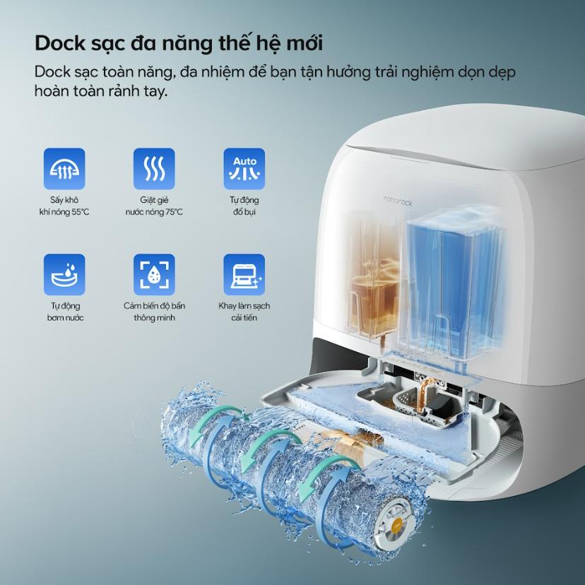 Dock sạc của Roborock Qrevo Curv 2 Flow không chỉ đơn thuần là nơi nạp năng lượng cho robot mà còn sở hữu nhiều tính năng vượt trội như tự động đổ bụi, giặt giẻ lau bằng nước nóng 75°C và sấy giẻ lau ở nhiệt độ 55°C. Đây là một cải tiến đáng giá, giúp người dùng tiết kiệm thời gian và duy trì hiệu quả làm sạch cao nhất.