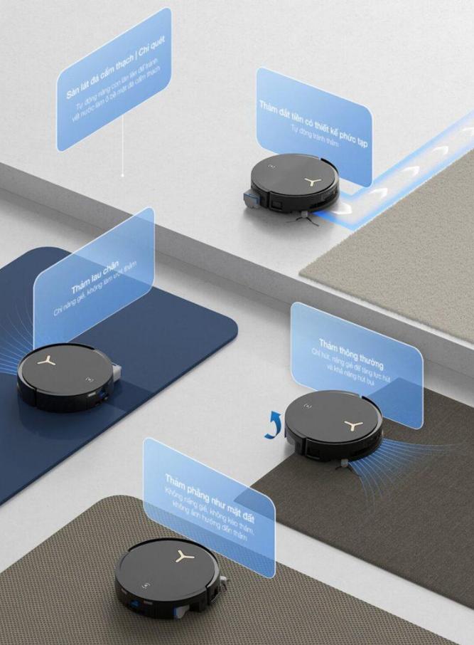 Ngoài khả năng hút bụi, robot còn tích hợp công nghệ chăm sóc sàn thông minh với cảm biến siêu âm, tự động nhận diện thảm và điều chỉnh chế độ phù hợp. Robot tăng lực hút trên thảm ngắn, nâng con lăn hoặc tránh thảm lông dài để bảo vệ bề mặt. Ecovacs X8 Pro Omni Auto Water Kit đảm bảo làm sạch hiệu quả và an toàn cho mọi loại sàn.
