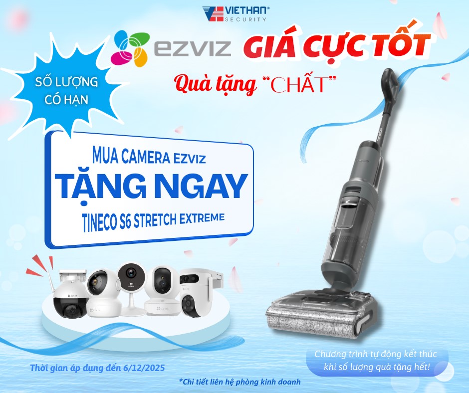 Tin nóng hổi cho các tín đồ công nghệ và an ninh! Việt Hàn Security chơi lớn: Mua CAMERA EZVIZ – Nhận ngay QUÀ TẶNG "CHẤT" siêu khủng: MÁY HÚT BỤI LAU NHÀ TINECO S6 STRETCH EXTREME, dành cho những khách hàng thông thái mong muốn vừa bảo vệ an ninh, vừa nâng tầm tiện nghi cho ngôi nhà. Chỉ trong thời gian có hạn, khi mua bất kỳ dòng camera EZVIZ chính hãng, khách hàng sẽ nhận ngay món quà giá trị – máy hút bụi lau nhà Tineco S6 Stretch Extreme, giải pháp dọn dẹp thông minh, hiện đại, giúp tiết kiệm thời gian và công sức đáng kể cho cả gia đình.