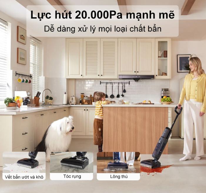 Chiếc máy hút bụi lau nhà đa năng, đột phá, được thiết kế dành riêng cho các gia đình hiện đại. Máy hút bụi sở hữu lực hút mạnh mẽ lên tới 20.000Pa, dễ dàng loại bỏ bụi mịn, lông thú cưng, tóc rối hay các vết chất lỏng đổ trên sàn nhà chỉ sau một lần đi máy.