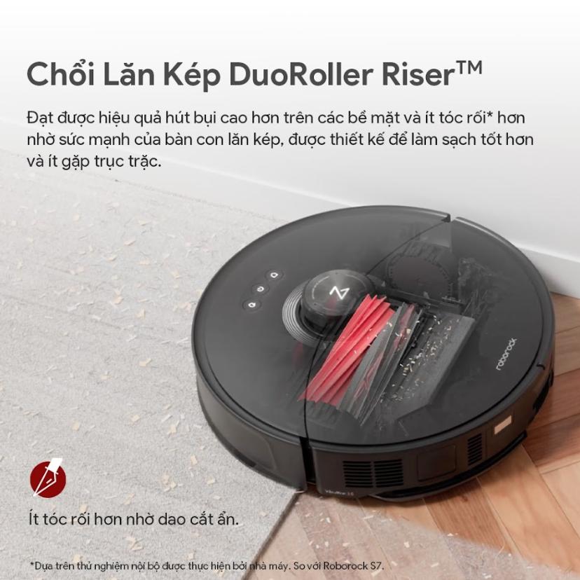 Một trong những điểm nổi bật của robot hút bụi Roborock S8 MaxV Ultra chính là hệ thống chổi lăn kép DuoRoller Riser. Thiết kế này giúp giảm thiểu tình trạng rối tóc, tăng hiệu quả làm sạch và phù hợp với mọi loại bề mặt sàn. Từ sàn gỗ, gạch men đến thảm, Roborock đều xử lý gọn gàng và nhanh chóng.