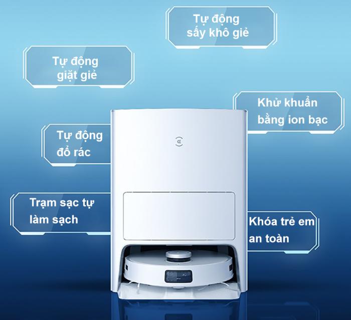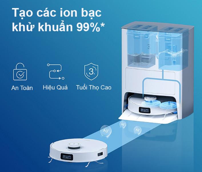 Điểm mạnh khiến Ecovacs được yêu thích chính là khả năng tự động hóa gần như hoàn toàn. Với trạm sạc OMNI Station đa năng, robot có thể tự giặt giẻ lau bằng nước nóng 55°C, sấy khô bằng luồng khí nóng để ngăn vi khuẩn và nấm mốc, đồng thời tự đổ rác vào túi chứa trong trạm.
