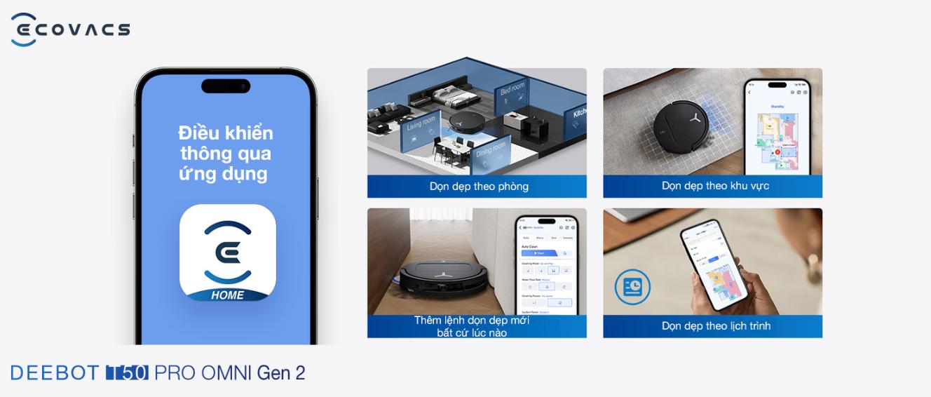 Người dùng có thể dễ dàng điều khiển Deebot T50 Pro Gen 2 thông qua ứng dụng trên điện thoại thông minh. Ngoài ra, sản phẩm còn tương thích với các trợ lý ảo như Google Assistant và Amazon Alexa, cho phép bạn ra lệnh bằng giọng nói một cách tiện lợi.