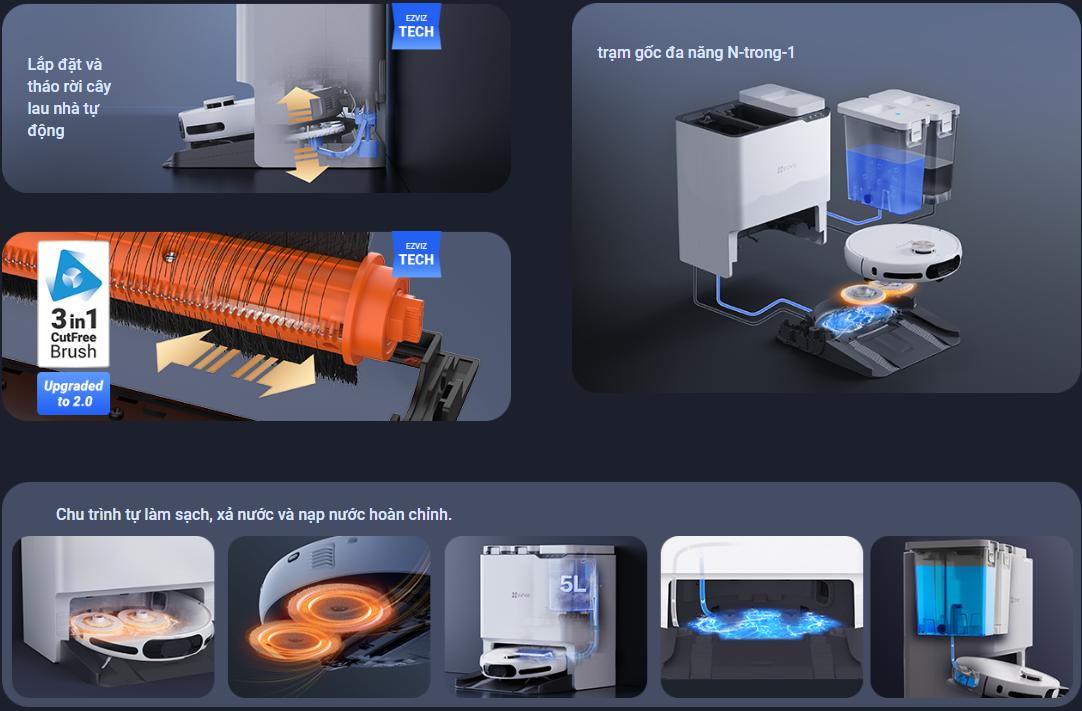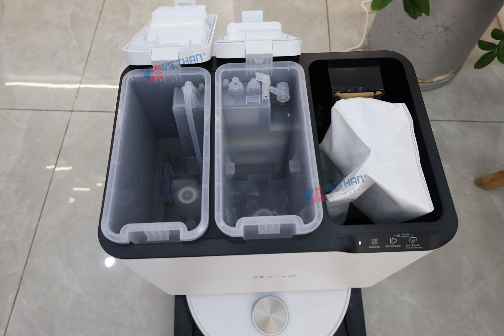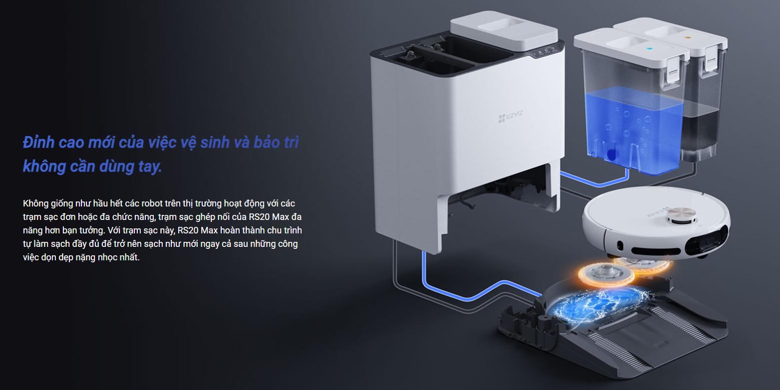 Một điểm nổi bật khác của robot lau nhà Ezviz RS20 Max chính là trạm sạc đa chức năng. Trạm sạc không chỉ giúp robot tự động nạp điện mà còn thực hiện hàng loạt các tác vụ như lắp đặt và tháo cây lau nhà, châm nước sạch, giặt cây lau bằng nước nóng và sấy khô bằng khí nóng. Ngoài ra, trạm sạc còn có khả năng tự động đổ thùng chứa bụi, giúp bạn không cần phải tiếp xúc trực tiếp với bụi bẩn.