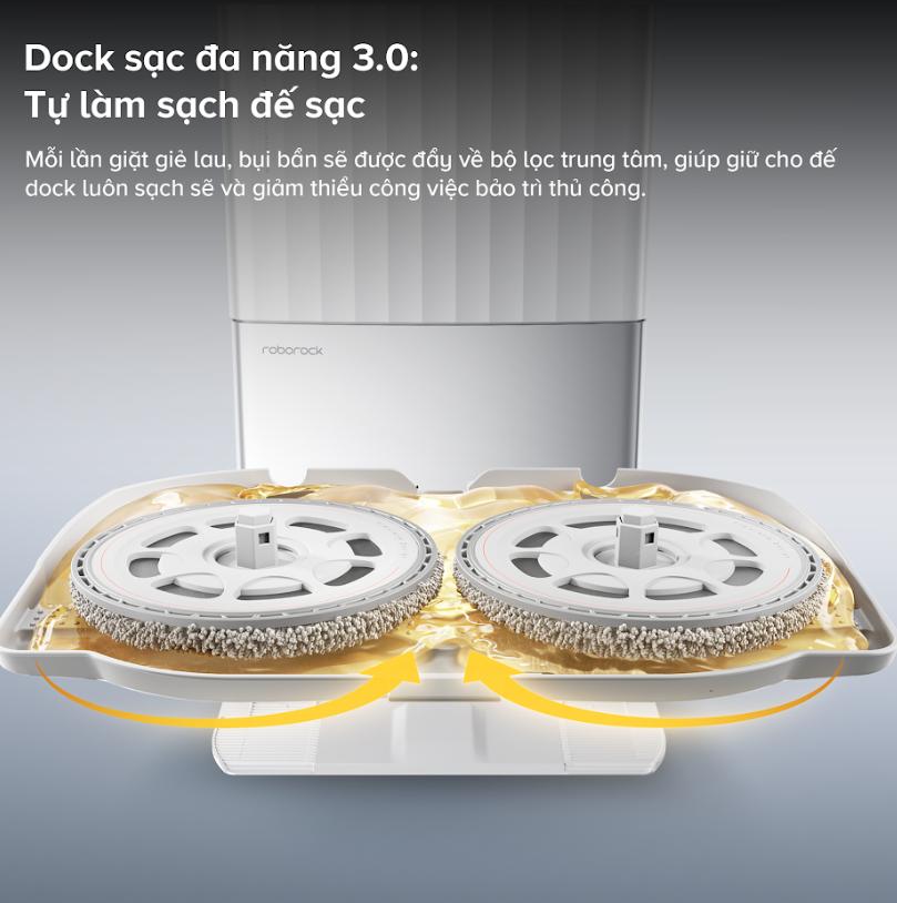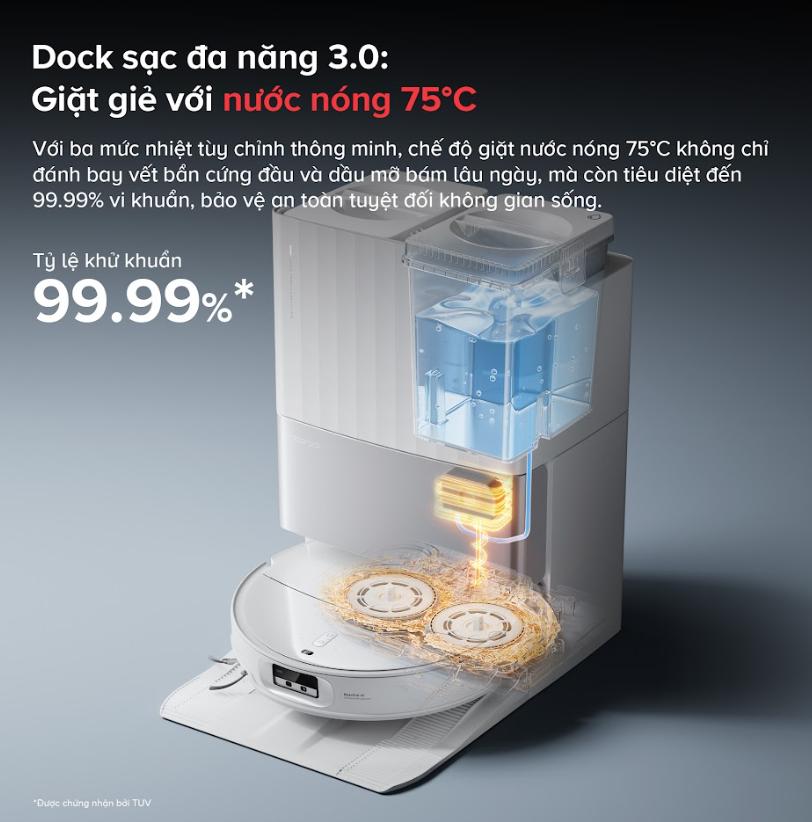 Điểm khác biệt lớn nhất của robot hút bụi Roborock Qrevo EdgeT chính là trạm sạc đa năng 3.0 với 8 tính năng hiện đại. Không chỉ là nơi sạc pin, trạm sạc còn tích hợp tính năng tự động đổ bụi, giặt giẻ bằng nước nóng 75°C, sấy khô giẻ bằng khí ấm ở nhiệt độ 45°C và tự làm sạch dock sạc. Điều này giúp bạn tiết kiệm thời gian và công sức trong việc bảo trì thiết bị.