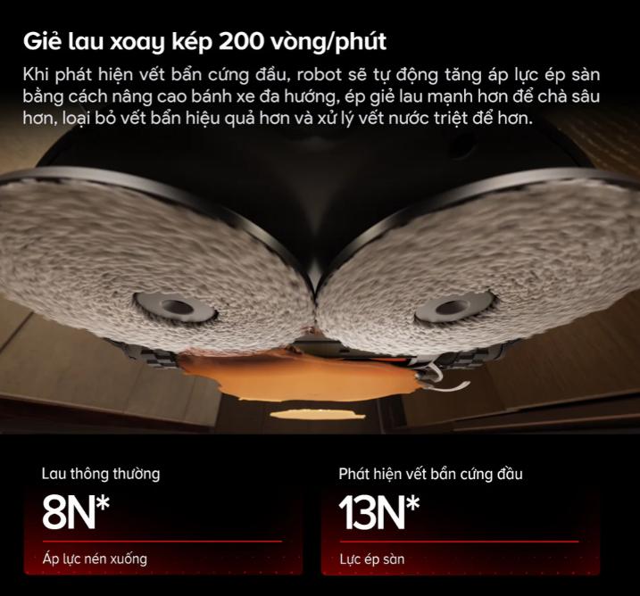Không chỉ hút bụi, Roborock Saros 20 còn tích hợp hệ thống lau thông minh Dual Spinning Mops với tốc độ quay lên tới 200 vòng/phút. Điều này đảm bảo sàn nhà luôn sạch bóng, không để lại vết bẩn cứng đầu. Đặc biệt, tính năng tự động nâng giẻ lên đến 15 mm giúp robot dễ dàng di chuyển qua các loại sàn khác nhau mà không lo làm bẩn thảm.
