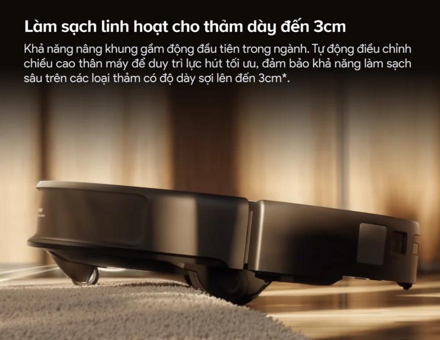 Nhờ vào công nghệ AdaptLift™ 3.0, Roborock Saros 20 có khả năng vượt qua các chướng ngại vật cao tới 4.5 cm + 4 cm, giúp robot di chuyển linh hoạt trên mọi địa hình, từ sàn gỗ, gạch men đến thảm dày 3cm.