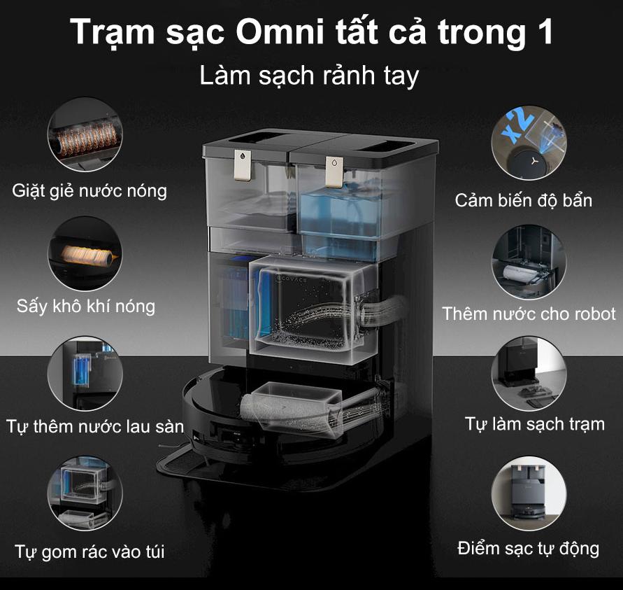 Công dụng lớn nhất mà Việt Hàn Security muốn mang đến cho bạn chính là Sự tự do. X8 Pro Omni được trang bị trạm sạc Omni toàn năng, tự động thực hiện mọi công việc "bẩn" nhất: từ tự động đổ rác vào túi chứa bụi kháng khuẩn, đến việc giặt giẻ bằng nước nóng để diệt khuẩn và sấy khô để ngăn chặn mùi hôi ẩm mốc. Bạn không còn phải chạm tay vào nước bẩn, không còn phải lo lắng về việc giẻ lau bị hôi sau vài ngày sử dụng. Robot sẽ tự chăm sóc chính nó và luôn trong trạng thái sẵn sàng để bảo vệ không gian sống của bạn.