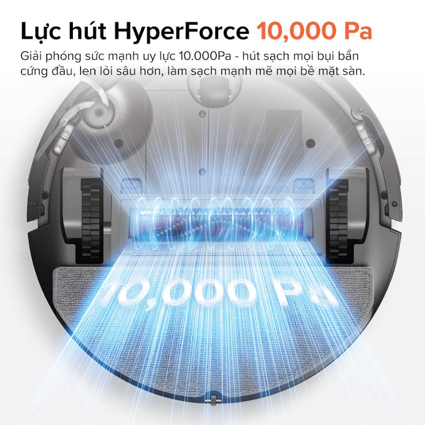Roborock Q10 VF+ sở hữu lực hút HyperForce lên đến 10.000 Pa, giúp làm sạch hiệu quả trên mọi bề mặt sàn, từ gạch men, gỗ đến thảm. Với sức hút mạnh mẽ này, robot dễ dàng loại bỏ bụi bẩn, lông thú cưng và các hạt nhỏ li ti mà mắt thường khó thấy.
