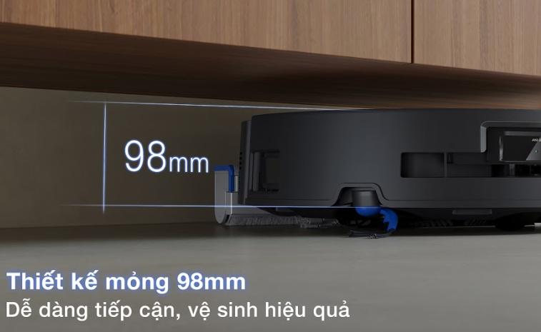 Robot hút bụi T80 Omni với thiết kế siêu mỏng chỉ 98mm mang lại khả năng làm sạch vượt trội, đặc biệt ở những khu vực khó tiếp cận như gầm giường, gầm tủ hay gầm sofa, nơi bụi bẩn thường tích tụ nhiều. Nhờ thiết kế nhỏ gọn này, T80 Omni phù hợp với các không gian có nội thất thấp hoặc nhiều vật dụng sát sàn, đảm bảo việc di chuyển linh hoạt mà không làm mất đi sự chính xác của các cảm biến.