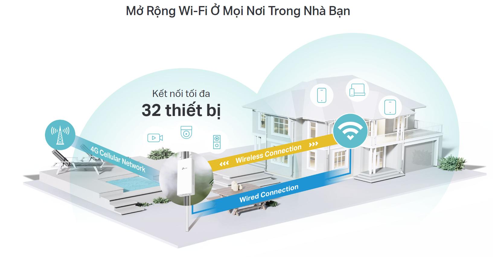 Thiết bị được trang bị các ăng-ten hiệu suất cao, giúp mở rộng phạm vi phủ sóng Wi-Fi và đảm bảo tín hiệu luôn ổn định ngay cả ở những khu vực xa trung tâm. Đây là giải pháp tuyệt vời cho các khu vực nông thôn, công trường, hoặc các địa điểm tổ chức sự kiện ngoài trời.