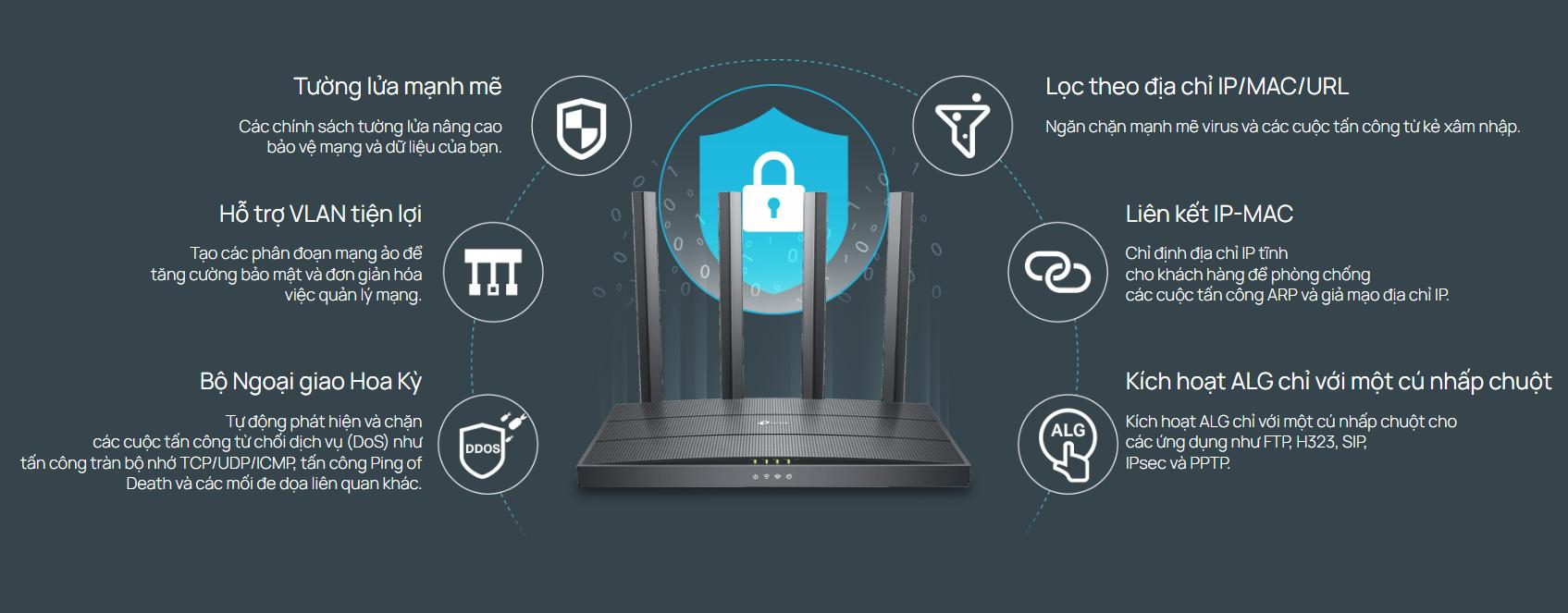 TP-Link ER605W được trang bị nhiều tính năng bảo mật tiên tiến như tường lửa SPI, lọc IP/MAC/URL và bảo vệ chống tấn công DoS. Những tính năng này giúp bảo vệ mạng khỏi các mối đe dọa từ bên ngoài, đảm bảo an toàn cho dữ liệu và thông tin của người dùng.